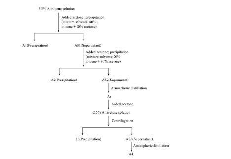 1.2.1瀝青質(zhì)及其亞組分的分離利用正己烷沉淀出原油中的瀝青質(zhì)A.利用混合溶劑(甲苯和丙酮)沉淀法,將A分為4個不同的亞組分,分離流程如Scheme 1所示。首先,制備質(zhì)量分?jǐn)?shù)為2.5%的A甲苯溶液,作為初始瀝青質(zhì)溶液,然后加入丙酮,將該混合物(甲苯/瀝青質(zhì)/丙酮)靜置20 h后,以3500 r/min的轉(zhuǎn)速離心40 min,分別收集瀝青質(zhì)的第1個亞組分A1和上清液AS1.在AS1中繼續(xù)加入丙酮至濃度為80%,離心沉淀,分別收集瀝青質(zhì)的第2個亞組分A2和上清液AS2.通過常壓蒸餾去除AS2中的溶劑,得到瀝青質(zhì)的中間亞組分Ai.將Ai以質(zhì)量分?jǐn)?shù)為2.5%的濃度溶于丙酮,靜置20 h后,離心40 min得到瀝青質(zhì)的第3個亞組分A3和上清液AS3,然后通過常壓蒸餾去除AS3中的溶劑得到瀝青質(zhì)的第4個亞組分A4.