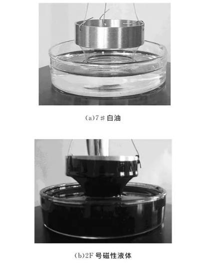 力敏傳感器定標(biāo)數(shù)據(jù)見表1,使用Origin軟件對直線進(jìn)行擬合,可得力敏傳感器靈敏度B=7.727V/N.測量無外加磁場作用的磁性液體表面張力系數(shù)時,為直觀觀察拉脫時液膜的變化過程,將培養(yǎng)皿放置于電磁線圈端部進(jìn)行測量,圖3為拉脫過程中某一瞬間液膜的收縮狀態(tài),從圖中可看到,磁性液體的液膜拉得更長,液膜收縮的趨勢比白油更明顯,這主要是因?yàn)榇判砸后w中加入的表面活性劑降低了其表面張力。可從表面張力形成原理來分析其中的原因:第一,液體表面張力系數(shù)的大小宏觀上反映出液體表面具有自動收縮的趨勢,表面張力系數(shù)較大的白油由于分子和分子之間的引力較大,表面層分子更容易向液體內(nèi)部運(yùn)動,某一拉力作用下,液膜斷裂,不易拉起較長的液膜;第二,不同液體對同一種固體的浸潤程度不一樣,表面張力系數(shù)小的液體(0.03N/m左右),幾乎能浸潤一切固體;表面張力系數(shù)較大的液體,只能浸潤某些固體;7#白油的表面張力系數(shù)大于磁性液體,片狀吊環(huán)和磁性液體的結(jié)合力大于片狀吊環(huán)和7#白油的結(jié)合力;液膜不容易和片狀吊環(huán)脫離,拉起來的液膜比較長。