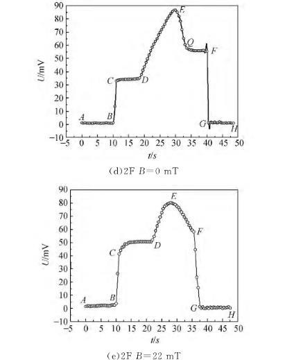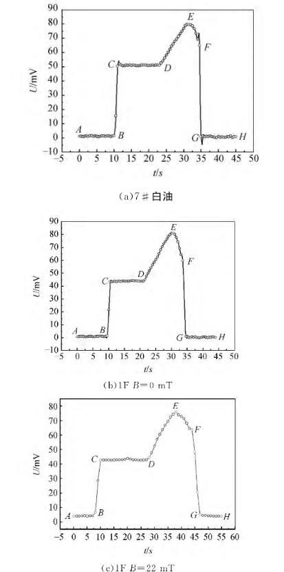 使用拉脫法測量了磁性液體的磁表面張力,無外加磁場作用時(shí),磁性液體的表面張力小于其載液的表面張力,磁性液體液膜拉得更長,液膜收縮的趨勢比白油更明顯,這主要是因?yàn)榇判砸后w中加入的表面活性劑降低了其表面張力。由液膜拉脫過程電壓變化曲線可觀察到:不同條件下磁性液體的電壓變化情況不同,無外加磁場作用時(shí)2F號磁性液體在EF階段存在轉(zhuǎn)折點(diǎn)Q,越過轉(zhuǎn)折點(diǎn),QF階段電壓變化較平緩,且表面張力越小;而7#白油和1F磁性液體并未出現(xiàn)此現(xiàn)象,這主要是因?yàn)?#白油和1F磁性液體表面張力較大,2F號磁性液體由于表面張力較小,其液體分子與分子之間的作用力較弱,宏觀表現(xiàn)為拉脫的液膜更長,液膜在空氣中會存在一段時(shí)間。有外加磁場作用時(shí),2F號磁性液體在FG階段并未出現(xiàn)電壓變化平緩的中間過程,但FG階段出現(xiàn)了另一些數(shù)據(jù)點(diǎn),液膜破裂的時(shí)間大于無外加磁場作用時(shí)的時(shí)間,主要是由于外加磁場增強(qiáng)了磁性顆粒之間的相互作用,分子和分子之間的磁吸引力增強(qiáng),導(dǎo)致液膜逐步破裂。