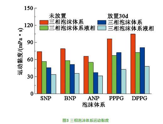 DPCG與DWS和聚合物具有較強(qiáng)的靜電、范德華力和纏繞作用,使其三相泡沫體系具有較大的拉伸黏度、剪切黏度和黏彈性,導(dǎo)致DPCG三相泡沫體系運(yùn)動黏度最大。而PPCG僅具有短支鏈,與DWS和聚合物的靜電、范德華力和纏繞作用相對較弱,導(dǎo)致其運(yùn)動黏度低于DPCG的。硬質(zhì)納米顆粒在溶液中與DWS和聚合物的靜電、范德華力和纏繞作用較弱,因此其三相泡沫體系運(yùn)動黏度較低。