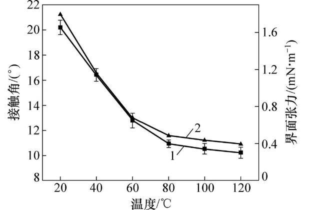 對20,40,60,80,100和120℃溫度下DBTL在CBT500光滑薄板上靜態(tài)接觸角進行測量,結(jié)果如圖4所示。結(jié)合上述溫度下DBTL界面張力1(如圖3所示),將和1代入式(3),計算相應(yīng)溫度下DBTL與CBT500的接觸角法界面張力12,結(jié)果如圖4中界面張力所示。由圖4可知:隨著溫度升高,接觸角和接觸角法界面張力具有相同的下降規(guī)律,不同溫度區(qū)間內(nèi)下降趨勢不同,20~60℃溫度區(qū)間下降趨勢最大,60~80℃溫度區(qū)間下降趨勢次之,80~120℃溫度區(qū)間下降趨勢平緩。由Young方程可得cos=(2?12)/1,代入上述關(guān)系,即溫度升高,接觸角減小;除此外,不同溫度區(qū)間內(nèi),DBTL對CBT500初期誘導(dǎo)率不同,從而導(dǎo)致不同溫度區(qū)間內(nèi)靜態(tài)接觸角、界面張力下降趨勢不一致。