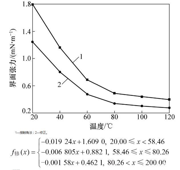 3)20℃下,采用調(diào)和平均法計算DBTL與CBT500界面張力為1.243 4 mN/m,接觸角法計算值為1.799 7 mN/m,調(diào)和平均法計算值相比接觸角法計算值約小44.74%,結(jié)果比=20≈1.447 4;依據(jù)相似理論,在20,40,60,80,100和120℃溫度下,修正后接觸角法計算得到的DBTL與CBT500界面張力比修正前整體小44.7%,更加接近真實值。