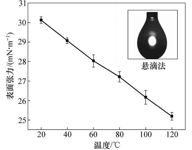 采用瑞典Biolin Scientific Theta光學(xué)接觸角測量儀的懸滴法測量20,40,60,80,100和120℃溫度下DBTL的表面張力。將DBTL緩慢從自制滴管中滴出,當(dāng)液滴外形出現(xiàn)輕微縮頸時,保溫30 s,測量該狀態(tài)下表面張力,每個溫度點測5次求算術(shù)平均值作為該溫度下表面張力。