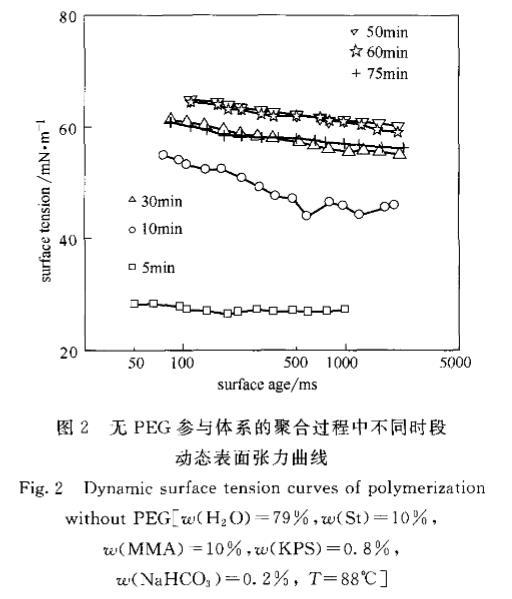 2.2聚合時間對動態表面張力變化趨勢的影響經引發,水相中溶解的單體聚合成鏈,聚合體系的組分也隨之發生變化。體系在水相中含有了自由基齊聚物,以及由齊聚物聚集形成的基本粒子或膠束。這些新產生的物質對DST曲線有很明顯的影響,加上PEG與聚合物鏈的相互作用,則使DST曲線有更多的變化。為了能明確地分析PEG在聚合過程中的作用,進行了有PEG和無PEG參與的聚合體系各時間段動態表面張力實驗比較。圖2和圖3分別為St/MMA在無PEG的水中和有PEG的水溶液中DST隨聚合時間的變化趨勢。
