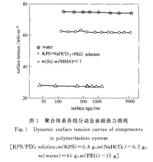 2.1無皂乳液聚合體系組分的動態表面張力未反應前,聚合體系可以分為油相和水相兩部分:油相部分主要為單體,水相部分主要為引發劑(過硫酸鉀)、pH緩沖劑(NaHCO。)、PEG和水。這兩部分的DST曲線如圖1所示。