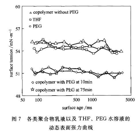 圖7各類聚合物乳液以及THF、PEG水溶液的動態表面張力曲線