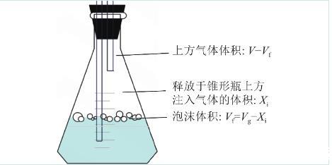 計算表面活性劑泡沫對氣體的緩釋效應(yīng)時,應(yīng)考慮到空氣中本來就含有氣體占比。假設(shè)錐形瓶上方由于注入氣體釋放出的組分含量為Xi;原有大氣中注入氣體占比為ai;通入氣體體積為Vg,泡沫層體積Vf=Vg?Xi,錐形瓶上方除去泡沫的氣體空間體積為V?Vf。推理計算公式如(2)所示。計算模型圖如圖3所示。