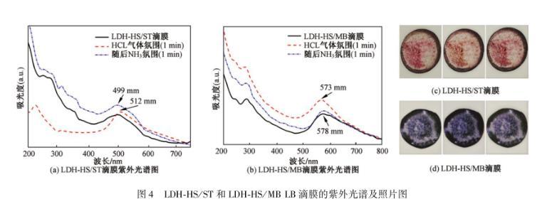 圖3(a)和3(b)分別顯示的是LDH-HS/ST和LDH-HS/MB多層LB復(fù)合膜沉積在石英底片上測得的UV光譜,以及經(jīng)1 min HCl氣體氛圍處理后和1 min NH3氣體氛圍處理后的UV變化光譜圖。圖3(c)和3(d)對應(yīng)展示了LDH-HS/ST和LDH-HS/MB復(fù)合膜酸堿氣體氛圍下石英片顏色變化前后對比圖。