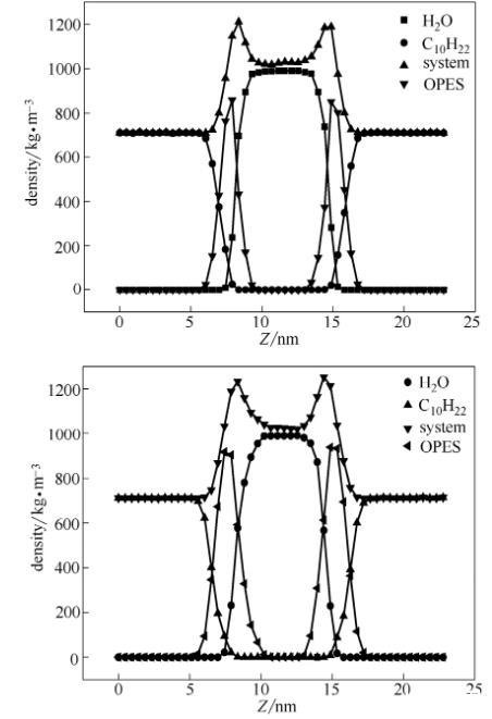 本文提取體系穩(wěn)定的S80、S120進(jìn)行分析,兩個(gè)體系的各部分密度圖如圖4所示。在平衡狀態(tài)下兩體系中水的平均密度分別為989.86 kg·m-3、992.43 kg·m-3,與國際溫標(biāo)318 K時(shí)水密度990.2 kg·m-3值接近;另外,兩體系中癸烷平均密度為711.49 kg·m-3、710.72 kg·m-3,與真實(shí)狀況下癸烷密度711.2 kg·m-3值接近,這表明模擬體系的模型選擇、力場參數(shù)都是準(zhǔn)確的,可以得出可靠結(jié)論。