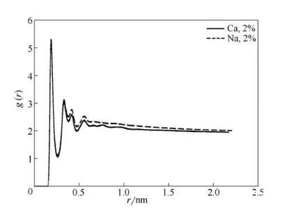 圖10中曲線分別代表在2%NaCl溶液、2%CaCl2溶液中磺酸基中的氧原子與水中氫原子之間的徑向分布函數(shù),如圖所示兩條曲線的峰值并未有太大差別,這說明OPES對Na+、Ca2+都有很好的抗鹽性。
