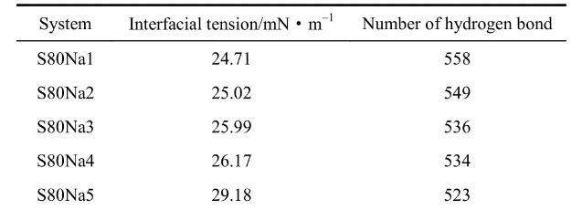 為進(jìn)一步確定OPES的耐鹽性能,可以再通過不同體系平衡狀態(tài)時(shí)相應(yīng)的界面張力和氫鍵數(shù)量來討論,相關(guān)數(shù)據(jù)如表3所示。