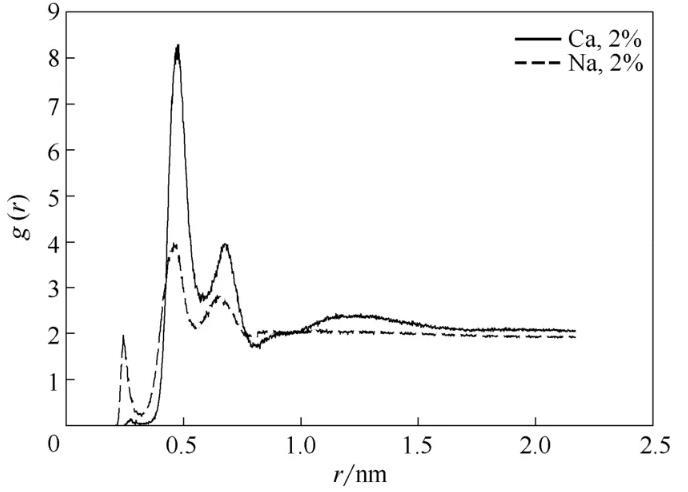 進(jìn)一步分析OPES對Na+、Ca2+抗鹽性的差別,考察了磺酸基中的氧原子與Na+、Ca2+的徑向分布函數(shù),如圖11所示。圖中兩曲線的峰值出現(xiàn)較大差距,其中Na+曲線的峰值明顯小于Ca2+曲線的峰值,這表明親水基團(tuán)與Na+的作用較小,也就是說Na+對OPES的性質(zhì)影響較小。因此,辛基酚聚氧乙烯醚磺酸鹽的抗鹽性順序?yàn)镹a+>Ca2+,與對序參數(shù)所做的分析結(jié)論相同。