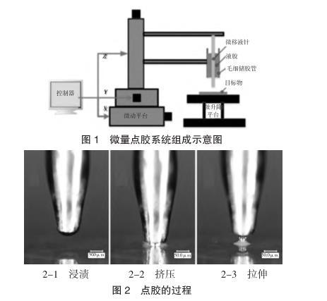 本課題組研制了一種基于移液針轉(zhuǎn)印原理的微量點膠系統(tǒng),該點膠系統(tǒng)所形成的膠斑直徑可達(dá)到數(shù)十微米,膠滴體積可達(dá)飛升-皮升的范圍。該系統(tǒng)的結(jié)構(gòu)如圖1所示。該系統(tǒng)由出膠單元、驅(qū)動單元和控制單元組成。其中,出膠單元為系統(tǒng)的核心,其主要包含微移液針和毛細(xì)儲膠管兩個關(guān)鍵元件,移液針通過在儲膠管內(nèi)的上下往復(fù)運動,實現(xiàn)膠液向基板的微量轉(zhuǎn)移。驅(qū)動單元由X/Y/Z三個方向的驅(qū)動電機(jī)和微升降平臺組成,用于驅(qū)動微移液針及點膠工件的運動。控制單元由PLC控制系統(tǒng)和LaBview開發(fā)的控制面板組成,實現(xiàn)對電機(jī)運動的自動控制。