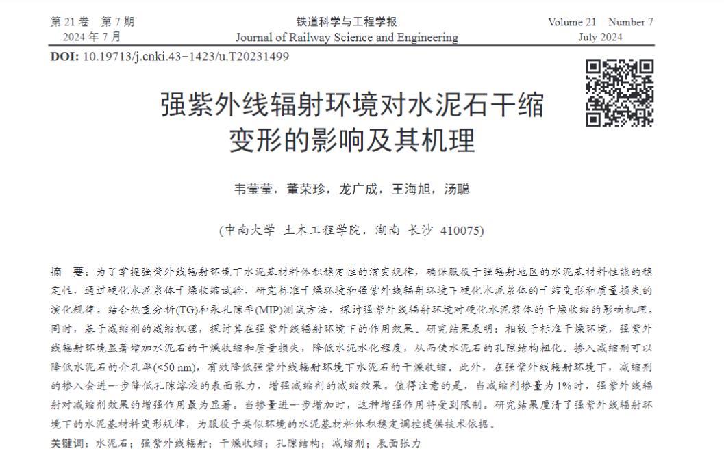 當摻量進一步增加時,這種增強作用將受到限制。研究結果厘清了強紫外線輻射環境下的水泥基材料變形規律,為服役于類似環境的水泥基材料體積穩定調控提供技術依據。
