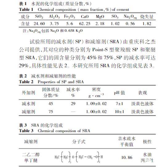 試驗所用的減水劑(SP)和減縮劑(SRA)由重慶科之杰公司提供,其對應(yīng)的種類分別為PointS型聚羧酸SP和聚醚型SRA,它們的固含量分別為45%和75%,SP的減水率可達29%,具體性能見表2.本研究所用SRA的化學(xué)組成見表3.