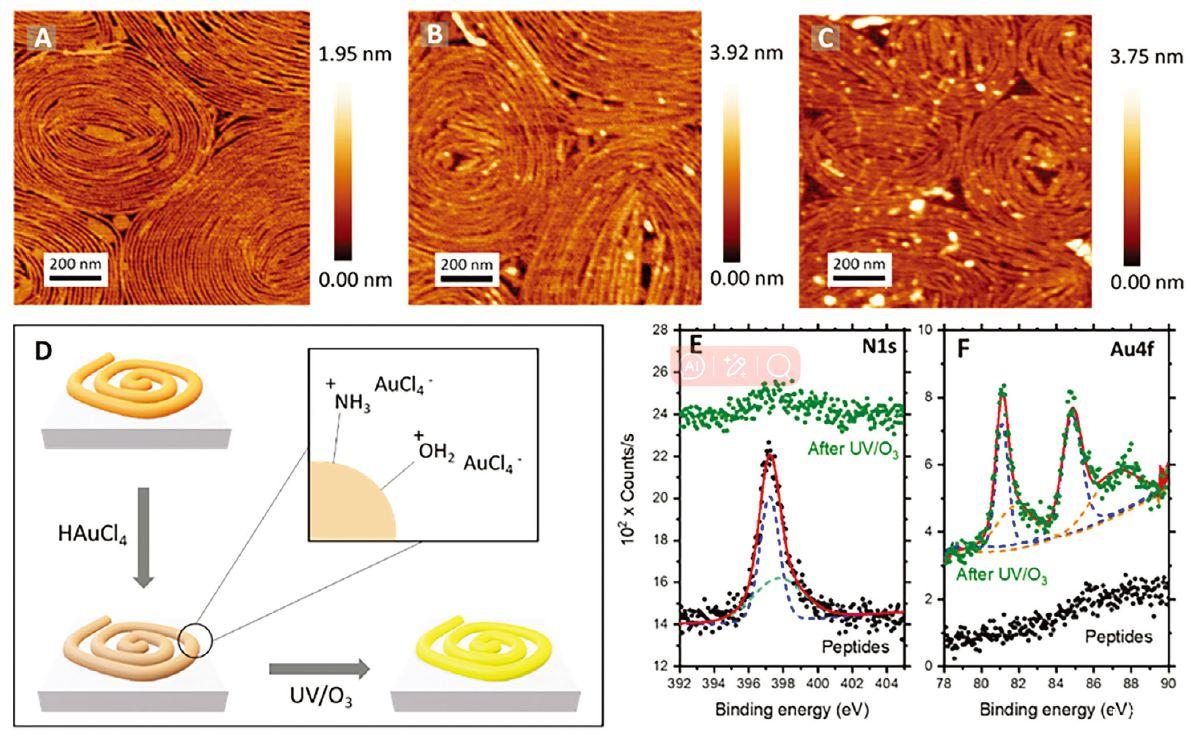 圖5、A)原始FP2肽在20 mN m-1表面壓力下在云母基底上的AFM顯微照片,B)浸入HAuCl4溶液30分鐘后的照片,以及C)在隨后的UV/O3降解處理后的照片。D)示意圖顯示了肽纖維和金前體鹽在水溶液中的相互作用。原始FP2肽的E)N 1s和F)Au 4f(黑點)以及無機摻入和UV/O 3降解后(綠點)的高分辨率XPS。
