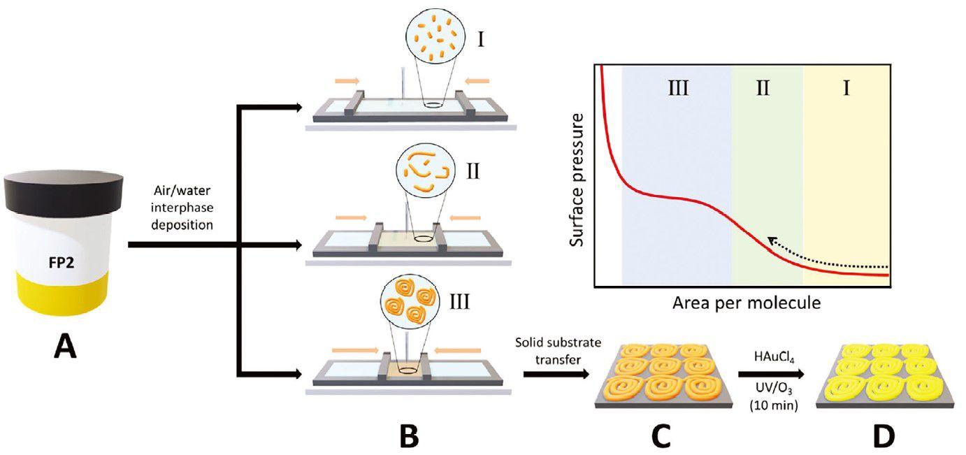 證明了病毒融合肽序列在朗繆爾槽內從納米原纖維形成彈性螺旋狀結構的卓越能力。此外通過控制空氣-水界面的壓縮力,獲得了具有特定曲率和纖維間距離的納米原纖維。單軸壓縮也證明了流體到固體的轉變,導致凝膠網(wǎng)絡的形成,如剪切流變學所證明的那樣。這里介紹的制造方法引入了單軸收縮方法,作為制造高度均勻的肽纖維單層并將其轉移到固體基質上的穩(wěn)健而有效的方法。最后螺旋狀結構用作制造金金屬復制品的模板。這種多技術方法不僅加深了對肽自組裝的理解,而且揭示了工程功能納米材料的新場景。