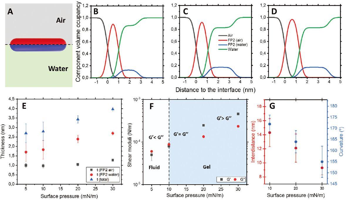 圖4、A)用于擬合NR數(shù)據(jù)的模型示意圖。B)10、C)20和D)30 mN m-1處界面的密度分布。E)通過NR獲得的纖維的總厚度。F)界面剪切流變測量。G)通過分析AFM圖像獲得纖維的間距和曲率。