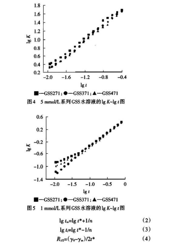 測得的DST數據經公式(1)處理后,令lgK表示lg[(γ0-γt)/(γt-γm)],以lgK對lgt作圖,結果見圖4~5。從直線的斜率與截距可以得到DST的特性參數n與t*值,并可根據公式(2)~(4)進一步得到誘導區結束時間ti、介平衡開始時間tm及t1/2時表面張力下降速率R1/2,結果見表2。