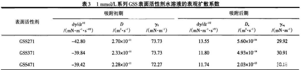 在吸附初期,GSS271的擴散系數最大,表明較容易擴散到次表面,這與在相同濃度下Rosen模型處理的n值最小吻合;在吸附后期,GSS471的擴散系數最大,這與其柔性連接鏈扭曲變形而在表面定向排列緊密相關,且與Rosen模型處理的t*值最大吻合。