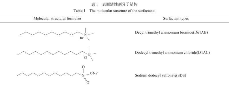 高純CO2:99.95%(φ),法國(guó)液化空氣集團(tuán);十二烷基三甲基氯化銨(DTAC)、十烷基三甲基溴化銨(DeTAB)、十二烷基磺酸鈉(SDS):含水1%(w),阿達(dá)瑪斯試劑有限公司。表面活性劑分子結(jié)構(gòu)見(jiàn)表1。實(shí)驗(yàn)用表面活性劑水溶液均為1.0%(w),實(shí)驗(yàn)用水為去離子水。