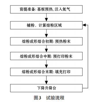 的當(dāng)量直徑,μm;ni為當(dāng)量直徑為di的顆粒的個(gè)數(shù)。計(jì)算可知,試驗(yàn)粉末的算術(shù)平均直徑為65μm。再取100 mL的試驗(yàn)粉料稱重,凈重為0.40 kg;計(jì)算得到試驗(yàn)粉末體積孔隙率ε為0.49,因此粉末顆粒并非最緊密堆積狀態(tài)。熔粉制備了橫截面積為5 cm2,長(zhǎng)5 cm的圓棒,每層鋪粉0.10 mm,實(shí)驗(yàn)流程如圖3所示。