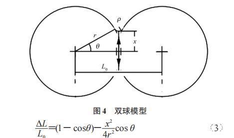 電子束熔粉與激光熔粉不同,因?yàn)殡娮邮且詭щ娏W拥亩ㄏ蜻\(yùn)動(dòng)產(chǎn)生的動(dòng)能作為能量來(lái)源的,所以必須有導(dǎo)電回路才能不斷地轟擊工件。但粉末層是孔隙材料,導(dǎo)電性較差,因此在電子束接觸粉末的瞬間可能出現(xiàn)靜電潰散現(xiàn)象。為了確定熔粉初期的工藝模式,文章選用了雙球模型,計(jì)算不發(fā)生靜電潰散時(shí)的臨界線收縮量,結(jié)構(gòu)模型如圖4所示。計(jì)算公式如式(3)。
