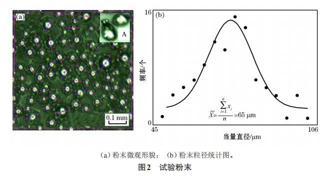本文以不銹鋼316L(022Cr17Ni12Mo2)球粉為成形原料,顆粒直徑為45~106μm(如圖2所示)【316L不銹鋼的微觀組織:相鄰熔覆道之間的搭接良好。組織主要由胞狀晶和呈外延生長(zhǎng)的柱狀晶組成,柱狀晶的取向各不相同。由于熔池邊界處粉末未熔化區(qū)域溫度較低,因此一部分晶粒沿著熔池邊界外延生長(zhǎng),同時(shí)在SLM過(guò)程中,熔池內(nèi)部經(jīng)歷快速冷卻,表面張力形成梯度,熔池內(nèi)部存在“馬戈紊流”,熔池內(nèi)發(fā)生對(duì)流,導(dǎo)致熔池內(nèi)部散熱方向發(fā)生改變,因此,造成晶粒顯示出不同的生長(zhǎng)方向。胞狀晶呈正六邊形,為柱狀晶的截面,柱狀晶晶粒十分細(xì)小,直徑分布在0.4~0.7μm。】,根據(jù)筆者已有的研究結(jié)果選擇合適的工藝,詮釋顆粒群的熔合線收縮和再結(jié)晶過(guò)程。由于試驗(yàn)粉末顆粒直徑分布廣,為了建立粉末計(jì)算模型,用式(1)、(2)計(jì)算了顆粒群的當(dāng)量直徑d和算術(shù)平均直徑d。