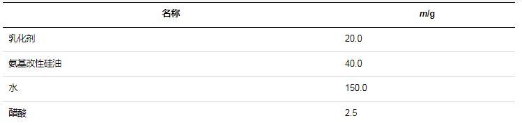 氨基改性硅油在未經乳化處理之前,通常為一種油狀或半固態的物質,不易與水相混合。而氨基改性硅油柔軟劑需要在水中分散均勻,才能被紡織物充分吸收和利用,發揮柔軟、抗靜電等作用。因此,上述步驟下制得的氨基改性硅油還需要進一步的乳化處理,才能形成氨基改性硅油柔軟劑,否則不能發揮柔軟劑的作用,反而還會損傷紡織物。室溫下,將乳化劑、氨基改性硅油、醋酸與水按照一定的比例混合,然后200 r/min攪拌5 min,即可制成氨基改性硅油柔軟劑。乳化方案中各物質比例見表1。