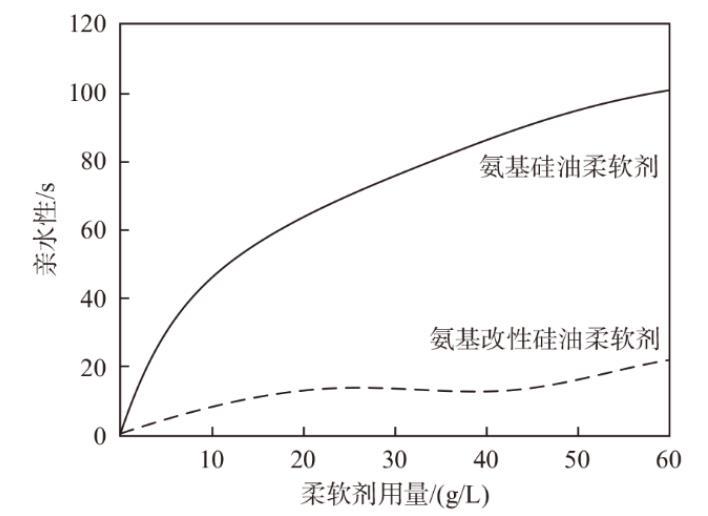 4)當(dāng)用量為20 g/L時(shí),氨基改性硅油柔軟劑親水性為10.4 s;當(dāng)用量為50 g/L時(shí),氨基改性硅油柔軟劑親水性小于20 s,與氨基硅油柔軟劑相比,氨基改性硅油柔軟劑在親水性方面有所改善。