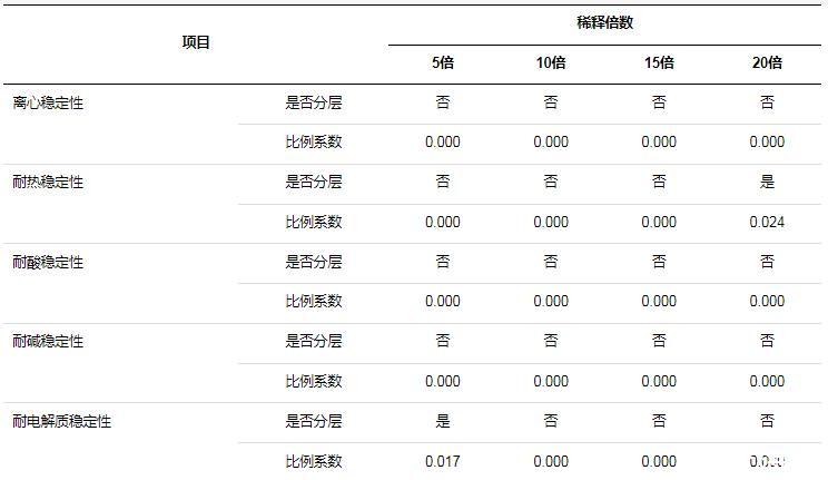 1)經(jīng)過稀釋后,耐熱穩(wěn)定性、耐電解質(zhì)穩(wěn)定性兩個(gè)測試項(xiàng)目雖然出現(xiàn)分層情況,但是比例系數(shù)均在0.1以下,氨基改性硅油柔軟劑保持較好的穩(wěn)定性;