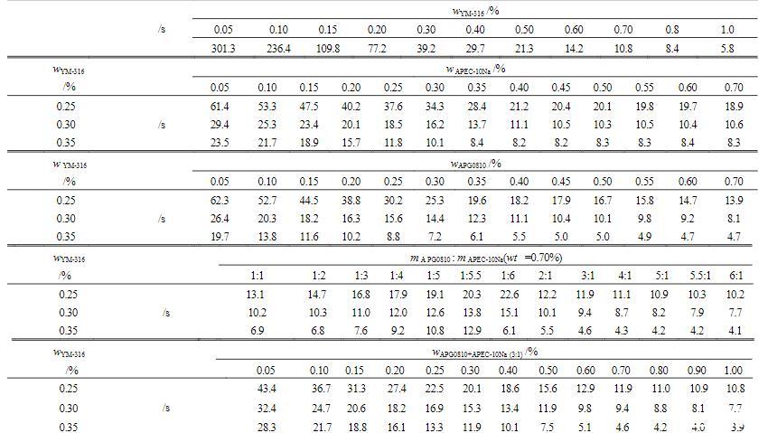由表2可知,YM-316在質(zhì)量分?jǐn)?shù)較低時起泡能力較低,25%析液時間較長,隨著質(zhì)量分?jǐn)?shù)的升高,起泡高度呈現(xiàn)上升趨勢,25%析液時間呈縮短趨勢。鑒于YM-316質(zhì)量分?jǐn)?shù)在0.25%~0.35%內(nèi),兼具較好的發(fā)泡性能和泡沫穩(wěn)定性,本實(shí)驗選擇質(zhì)量分?jǐn)?shù)為0.25%、0.30%和0.35%的YM-316溶液,分別與APEC-10Na和APG0810進(jìn)行復(fù)配,研究復(fù)配溶液的泡沫性能。由表2可以看出,APEC-10Na和APG0810的引入,有助于提高溶液的發(fā)泡能力。當(dāng)APEC-10Na和APG0810質(zhì)量分?jǐn)?shù)在0.2%~0.5%時,與YM-316復(fù)配效果最好,其中0.3%YM-316溶液與0.3%~0.5%APEC-10Na或APG0810復(fù)配后,溶液起泡效果和析液時間均較佳。綜合起泡能力和泡沫穩(wěn)定性兩方面性能,0.3%YM-316與0.7%的APEC-10Na和APG0810(APEC-10Na∶APG0810=1∶3)混合物組成的復(fù)配溶液具有最優(yōu)泡沫性能,其起泡高度最高達(dá)298mm,同時泡沫的25%析液時間可達(dá)到397s。