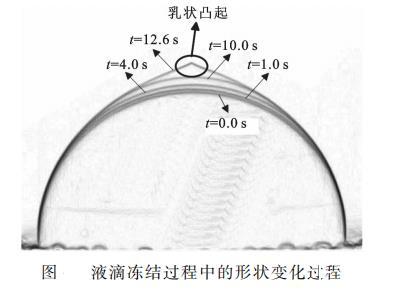 關于液滴在凍結完成后頂部形成乳狀凸起的現象,王皆騰等認為固-液相界面是因為液滴的形狀而呈現出凹曲面的分布特性,而且液滴兩側的凍結速度大于中心區域,這導致液滴的變形出現在液滴頂部。根據晶體生長理論,從界面張力的角度出發,彎曲界面上的界面張力將導致垂直于界面的附加力的出現,使得彎曲界面兩側的壓強不等,即產生界面壓強。這意味著界面張力有使界面面積縮小的傾向,凹曲面會產生向上的附加壓強,促進固-液相界面向上的推移過程,固-液界面為凹面時比平面更加有利于液滴的凝固。由于固-液相界面為凹曲面,在其向上的推移過程中,密度變化引起體積膨脹的效果會在液滴上部液相區不斷累積,表現為液滴高度的增加,最終在表面張力的作用下,液滴頂部會形成明顯的乳狀凸起,如圖2所示。