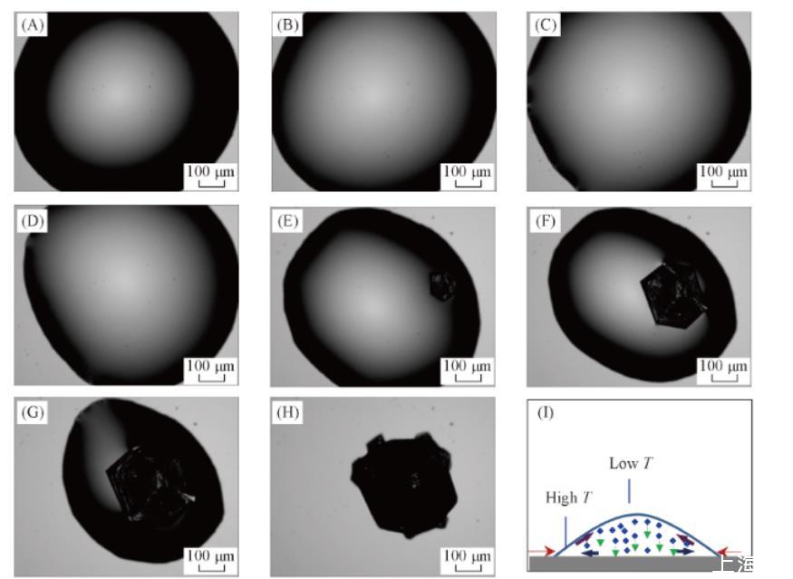 實驗發現,純水液滴和NaCl水溶液液滴在玻璃基底上蒸發時其三相接觸線均發生不同程度的收縮。圖1所示為NaCl溶液液滴的蒸發過程。可以看出,接觸線的收縮并非連續不斷,而是在一定時間內先保持“釘扎”[圖1(A),(B)].在此過程中,接觸角不斷減小,從而使得表面張力的水平分力增大,當其超越基底對接觸線產生釘扎作用時,就會引起接觸線的收縮。由于基底結構的不均勻性,液滴各方向的收縮也可能是不均勻的,如圖1(C)——(H)所示。由于蒸發過程中接觸線不能釘扎,蒸發造成的Marangoni對流以及重力沉降作用使得NaCl在液滴中心區域富集,如圖1(I)所示。因而NaCl晶體首先在液滴中心區域析出。