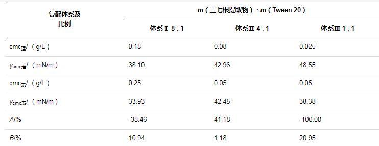根據(jù)Rosen相分離模型,當二元混合表面活性劑復配體系在吸附達到平衡時,溶液相與表面相的化學勢能相等(μ溶=μ表),從吸附達到飽和時溶液相與表面相、膠束相的化學勢能相等(μ溶=μ表=μ膠)出發(fā),推導出復配增效的最佳質(zhì)量比值約等于各單一組分臨界膠束濃度的比值,即m1∶m2≈cmc1∶cmc2。根據(jù)之前的實驗結果,近似地將三七根提取物與Tween 20的復配質(zhì)量比定為4∶1。