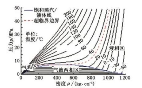 表面活性劑水溶液的密度與純水體系相近,其密度根據(jù)飽和水蒸氣溫度-壓力-密度-熱力學(xué)參數(shù)對(duì)照表確定,CO2密度與壓力溫度的關(guān)系見圖3。