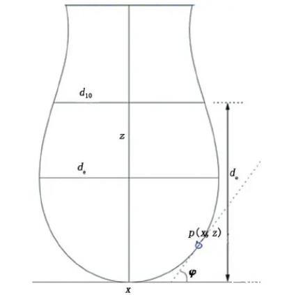 懸滴法測(cè)定液體的表面和界面張力原理見圖5。其中,de為懸滴最大直徑;d10為離頂點(diǎn)距離為de處懸滴截面直徑。