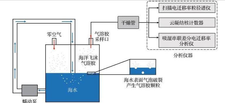 SSA生成裝置能夠在實驗室環境中模擬自然海洋系統,實現在受控條件下從天然海水中產生SSA,并結合儀器表征顆粒的粒徑分布和理化特性。目前常用的模擬裝置有鼓泡式發生器、射流式發生器及波浪破碎式發生器等。本文以射流式SSA發生器為例,介紹SSA的生成原理(圖2)。通常來說,發生器都具有進水口、進氣口和采樣口。利用蠕動泵將海水從發生器底部周期性循環到頂部噴嘴,形成一個俯沖射流水柱,撞擊水面并將空氣夾帶進入海水中,在水下一定深度產生氣泡羽流。當氣泡上升到水氣界面并破裂時,產生SSA顆粒。采用潔凈零空氣作為載氣,將生成的SSA顆粒通過氣溶膠采樣口進行采集,連接干燥管進行干燥。此后,使用掃描電遷移率粒徑譜儀測量SSA的粒徑分布和數濃度等。該裝置可連接其他儀器,如CCN計數器和吸濕串聯差分電遷移率分析儀等進行CCN活性及吸濕性等的表征。