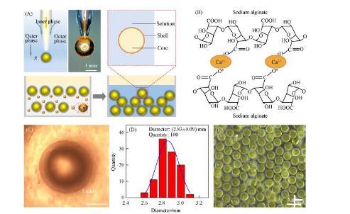 為了實現(xiàn)一步法制備大小均勻、尺寸可控、壁厚可調(diào)、生物相容的水/水微囊,需要設計同軸微流控器件,如圖1(A)所示。內(nèi)相黃原膠水溶液由內(nèi)管注入微流控器件;外相海藻酸鈉水溶液,由外管注入微流控器件。內(nèi)相在外相的剪切下形成液滴,同時外相在重力作用下脫離管口生成水包水的水/水微囊,并進一步通過鈣離子交聯(lián)海藻酸鈉水凝膠網(wǎng)絡,如圖1(B)所示。由于微流控器件對內(nèi)外相的精準調(diào)控,水/水微囊在光學顯微鏡下具有清晰穩(wěn)定的核殼結(jié)構圖1(C),平均尺寸(D)為(2.83±0.09)mm圖1(D)。該方法制備水/水微囊具有器件結(jié)構簡單、操作便捷、一步法成型、微囊尺寸均一可控、核殼結(jié)構穩(wěn)定、無需后處理等優(yōu)點圖1(E)。