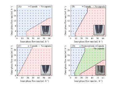 為了深入研究微流控器件結(jié)構對水/水微囊成型過程的影響規(guī)律,分別制備了內(nèi)管管口內(nèi)縮、內(nèi)外管管口平齊、內(nèi)管管口伸出、內(nèi)管管口內(nèi)縮外管管口不拉伸等4種同軸微流控器件,并通過系統(tǒng)改變內(nèi)相和外相流速,判斷水/水微囊的成型情況,最終確定水/水微囊的制備相圖,分別如圖2(A)——(D)所示。水/水微囊形成的關鍵是內(nèi)相在外相的剪切下形成液滴,同時外相在重力作用下脫離管口生成水/水微囊。由于內(nèi)外相均是水溶液,內(nèi)相/外相界面張力較小,并且流體黏度較大,內(nèi)相不容易在外相的剪切下形成液滴,進而被外相包裹形成水/水微囊,因此外相流速增大,對內(nèi)相剪切加強,更易形成水/水微囊。