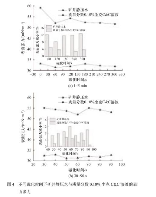 圖4不同磁化時間下礦井靜壓水與質量分數(shù)0.10%塵克C&C溶液的表面張力