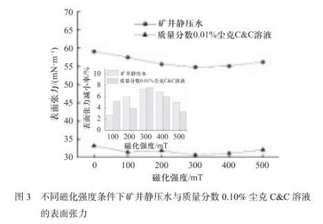 圖3不同磁化強度條件下礦井靜壓水與質量分數(shù)0.10%塵克C&C溶液的表面張力