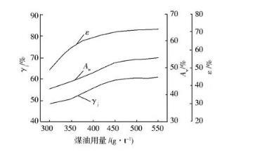1)采用煤油作捕收劑時,常溫(25℃)條件下,礦漿濃度為90 g/L,起泡劑用量為150 g/t,煤油用量為450 g/t,此時精煤產(chǎn)率為60.02%,尾煤灰分為52.56%,可燃體回收率為70.54%。