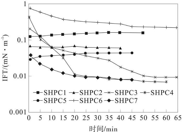 將SHPC1~7活性體系溶液配制為濃度大小為0.25%的溶液,密閉24 h,然后利用Texas-500C界面張力儀對界面張力進行動態(tài)測定,從而得到圖2所示的結(jié)果。