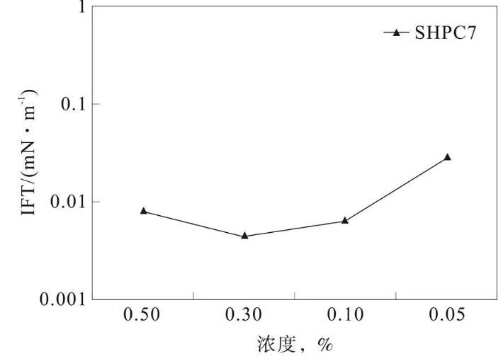 通過上述的圖可以看出,當(dāng)SHPC7濃度在0.05%的時候,此時的界面張力最差,油水界面張力保持在10-2mN/m的數(shù)量級。而當(dāng)濃度在0.3%的時候,此時的油水界面張力在10-3mN/m的數(shù)量級。由此可以看出,當(dāng)SHPC7的濃度在0.3%的時候,其界面張力最小,滿足試驗油田樣品的驅(qū)油需求。