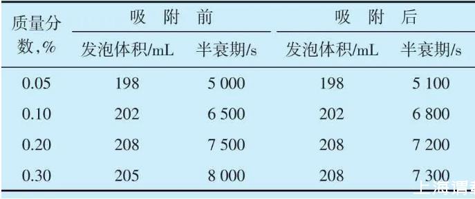 配制質(zhì)量分?jǐn)?shù)為0.05%,0.10%,0.20%和0.30%的磺基甜菜堿泡沫劑,再分別充入純度為99.9%的氮?dú)猓昧_氏泡沫儀測試氮?dú)馀菽w系吸附前后的泡沫性能。評價結(jié)果(表1)表明,當(dāng)溫度為80℃時,不同質(zhì)量分?jǐn)?shù)的氮?dú)馀菽w系在吸附前后發(fā)泡體積均保持在200 mL左右,半衰期大于5 000 s,表明均具有良好的起泡性能和穩(wěn)定性能。