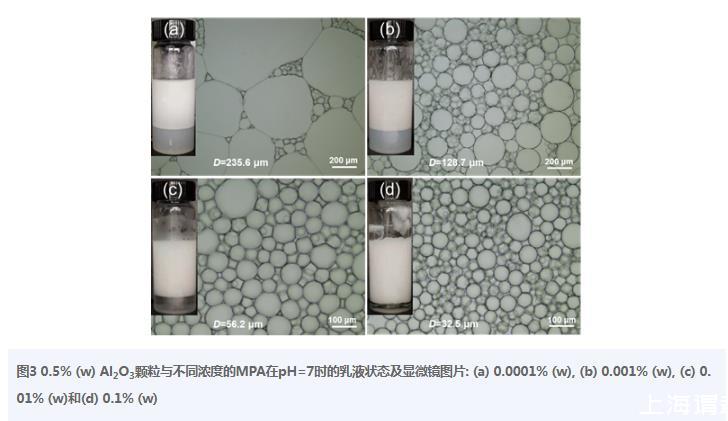 體系成份的濃度對乳液的外觀及粒徑有很大影響。圖3為固定0.5%(w)Al2O3顆粒濃度不變,研究在pH=7時(shí)不同MPA濃度對Pickering乳液的影響。隨著MPA濃度的不斷增加【0.0001%——0.1%(w)】,乳液下層析出的水相逐漸變澄清,說明MPA濃度增加,更多的Al2O3顆粒與MPA分子發(fā)生靜電相互作用,修飾后的Al2O3顆粒更容易從水相層中轉(zhuǎn)移到乳化層中,吸附在油水界面處,并且乳化層的高度也隨著MPA濃度的增加而升高,也說明更多的活性Al2O3顆粒參與乳化。乳液液滴粒徑隨濃度增加逐漸減小,從235.6μm降低到32.5μm,這是因?yàn)橛退缑嫣幍幕钚訟l2O3顆粒的量逐漸增多,可以穩(wěn)定更多的Pickering乳液液滴。