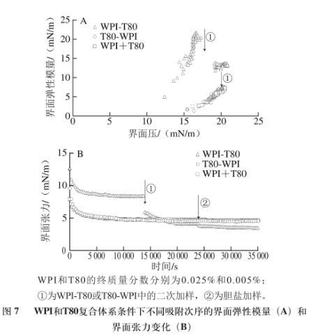 圖7 WPI和T80復合體系條件下不同吸附次序的界面彈性模量(A)和界面張力變化(B)