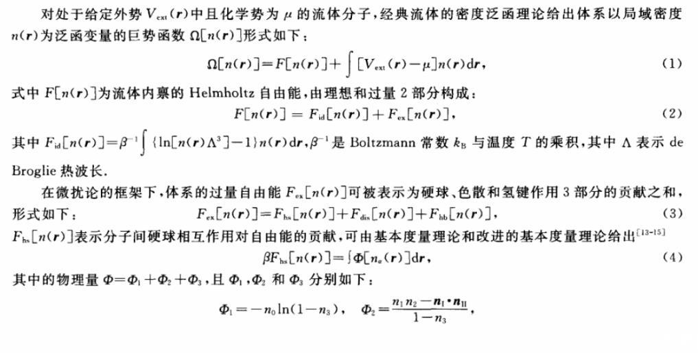 對(duì)處于給定外勢(shì)Vext(r)中且化學(xué)勢(shì)為μ的流體分子,經(jīng)典流體的密度泛函理論給出體系以局域密度n(r)為泛函變量的巨勢(shì)函數(shù)Ω[n(r)]形式如下: