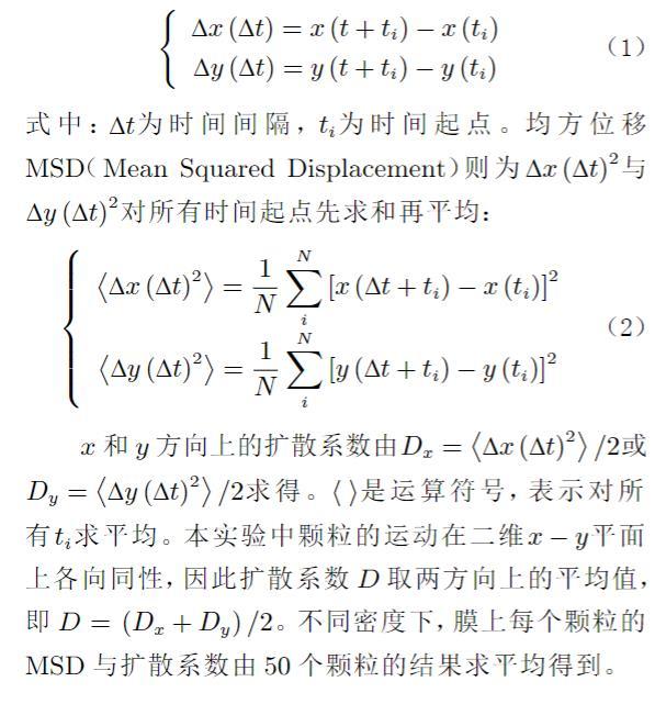 實驗采用的亞微米顆粒為羧酸鹽修飾的聚苯乙烯熒光微球,直徑分別為0.2、0.5和1.0μm。將該熒光微球稀釋至一定濃度后裝入噴霧器,噴霧器從高處緩緩將顆粒噴灑至膜表面。為防止表面對流干擾顆粒布朗運動的觀測,使用特氟龍圓環(huán)(外徑12 mm,內(nèi)徑6 mm,高2.5 mm)隔絕出一部分區(qū)域的膜,再蓋上蓋玻片,靜置10 h后,可基本消除表面對流。